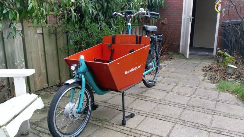 Hieronder een voorbeeld van een Bakfiets.nl omgebouwd met voorwielmotor en accu in de bagagedrager.